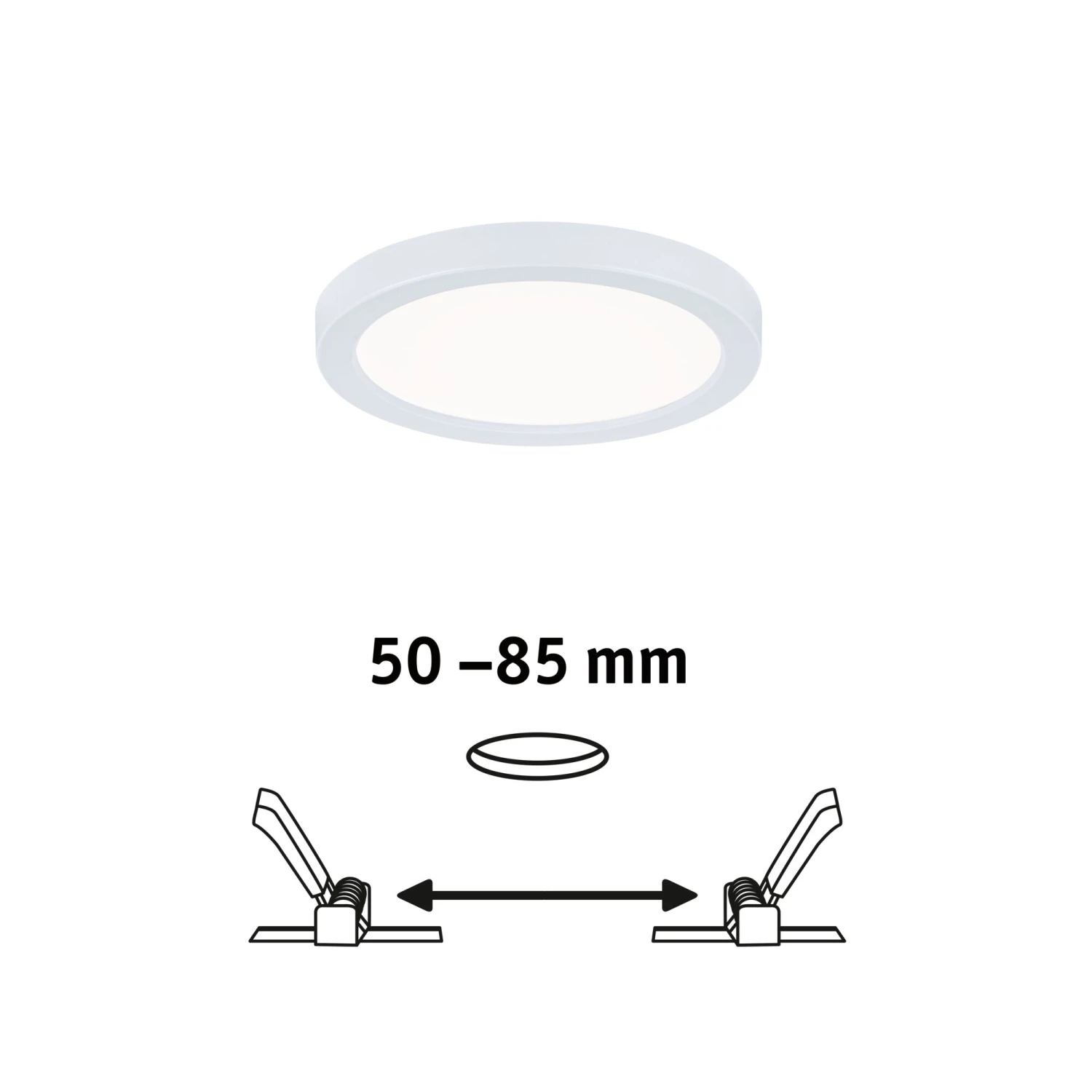 Das runde Einbaupanel Areo mit einem Durchmesser von 118 mm und einer Leistung von 6,5 Watt in Weiß sorgt für flächiges warmweißes Licht. Dank flexibler VariFit-Technik lassen sich die Klemmfedern für den Einbau stufenlos zwischen 50 und 85 mm einstellen. Damit kann das Panel sowohl in bereits vorhandene Bohrlöcher als auch in neue eingebaut werden. Bei einem Bohrlochdurchmesser von 85 mm wird eine Hohlraumtiefe von 30 mm benötigt und bei einem Durchmesser von 68 mm eine Tiefe von 55 mm.