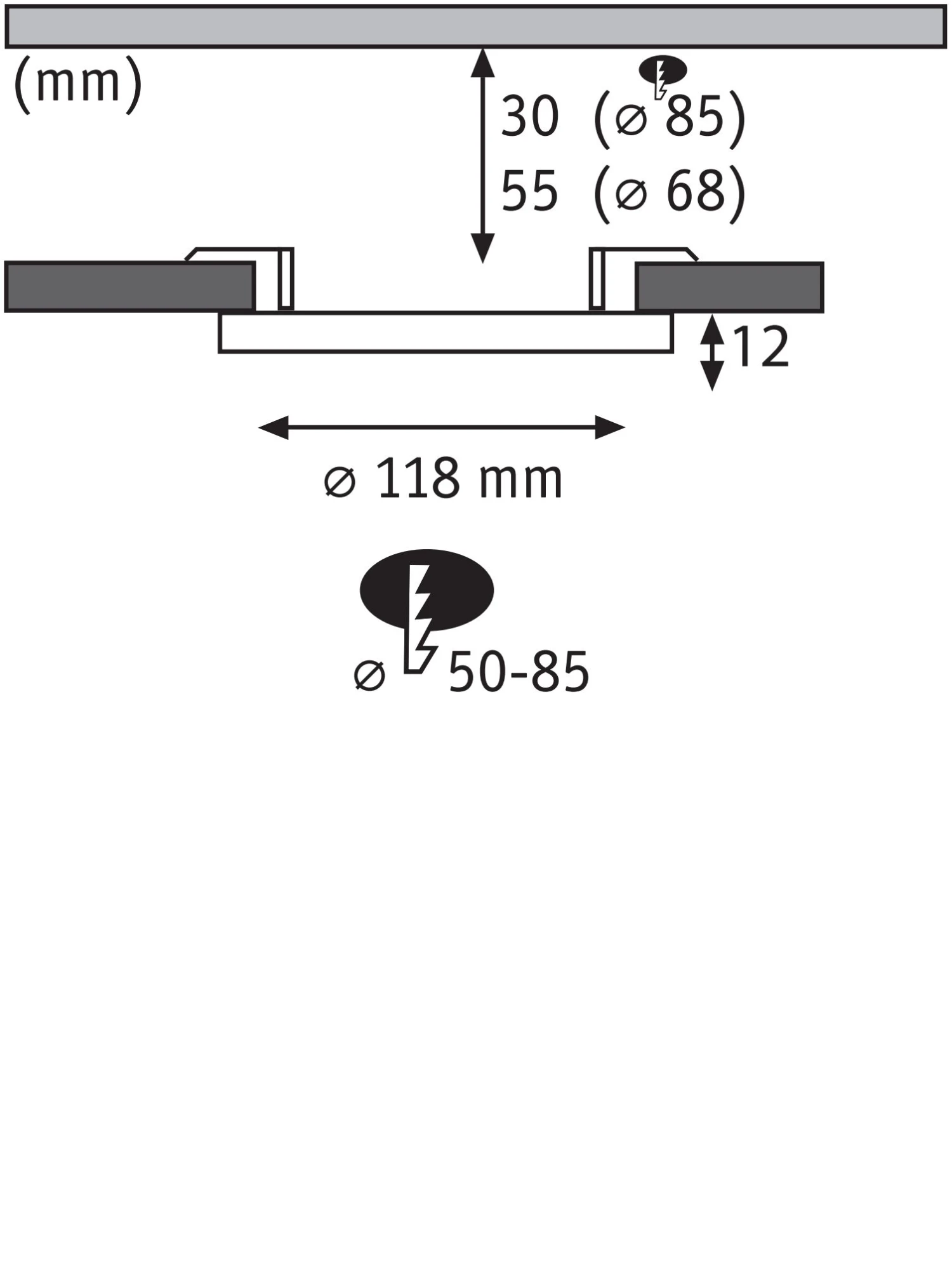 Das runde Einbaupanel Areo mit einem Durchmesser von 118 mm und einer Leistung von 6,5 Watt in Chrom matt sorgt für flächiges warmweißes Licht. Dank flexibler VariFit-Technik lassen sich die Klemmfedern für den Einbau stufenlos zwischen 50 und 85 mm einstellen. Damit kann das Panel sowohl in bereits vorhandene Bohrlöcher als auch in neue mit Standard Bohrkrone eingebaut werden. Bei einem Bohrlochdurchmesser von 85 mm wird eine Hohlraumtiefe von 30 mm benötigt und bei einem Durchmesser von 68 mm eine Tiefe von 55 mm.