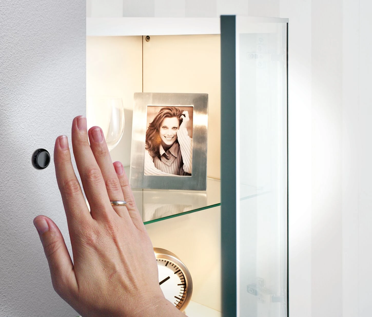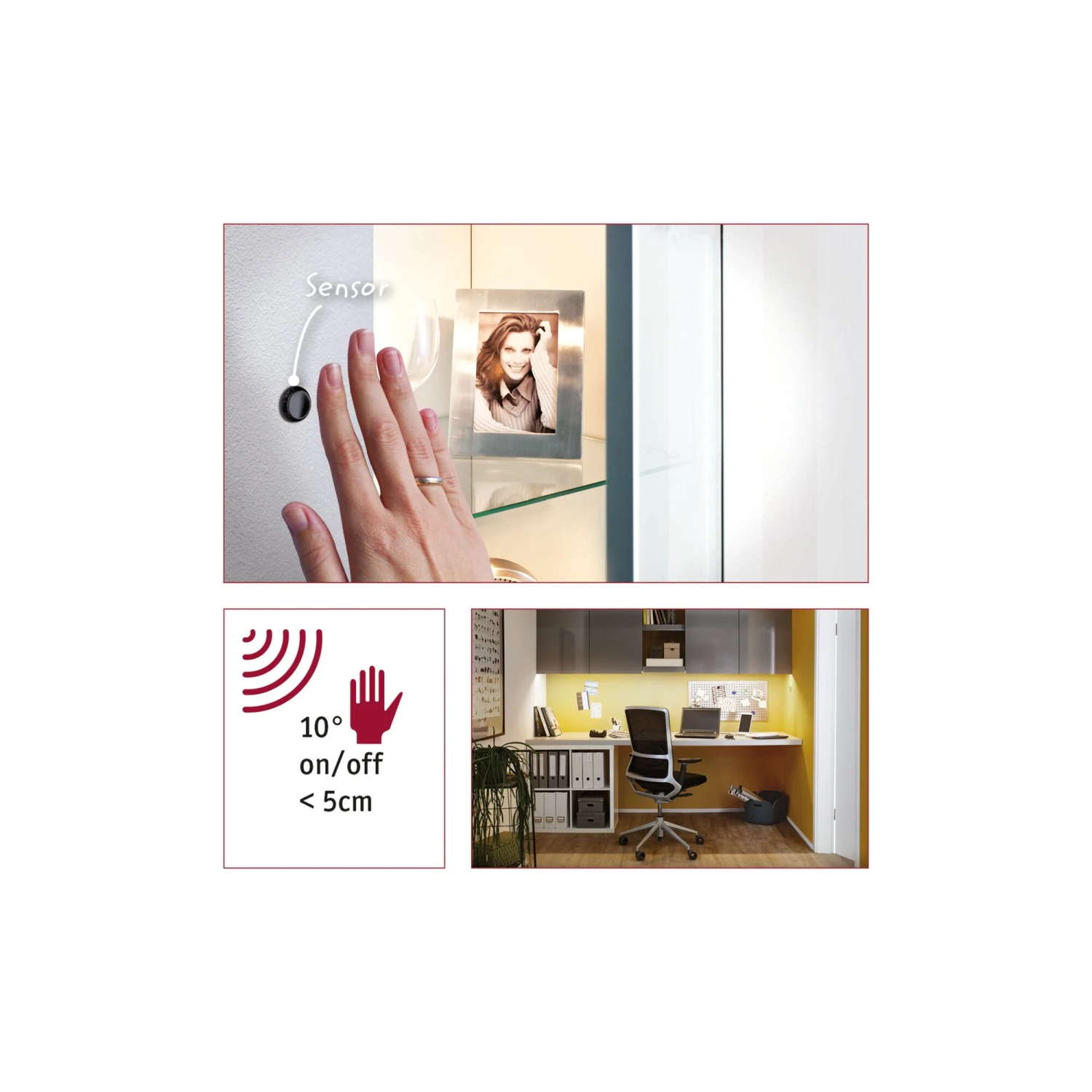 Mithilfe eines PIR-Sensors lassen sich Lichtinstallationen berührungsfrei durch Annäherung an- und ausschalten. Deshalb ist er eine ideale Ergänzung für Schrankbeleuchtungen in der Küche und im Badezimmer sowie LED-Stripes, mit denen Möbelstücke effektvoll in Szene gesetzt werden können. Der Sensor wird in einer gut erreichbaren Position in ein 14mm-Bohrloch eingebaut und trägt kaum auf. Das Kabel kann hinter dem Schrank, der Vitrine oder dem Regal entlanggeführt und dort mit der mitgelieferten Schalteinheit verbunden werden. Dadurch bleibt die gesamte Verkabelung unsichtbar.